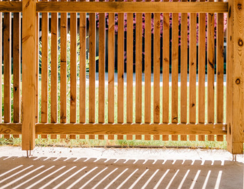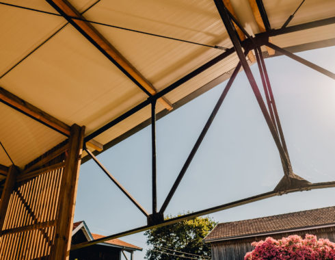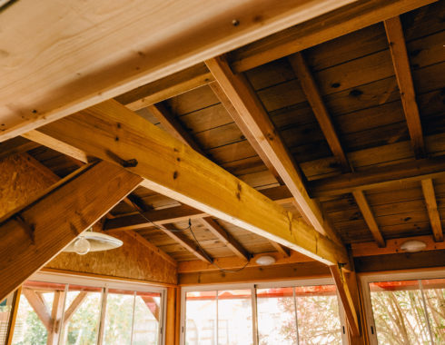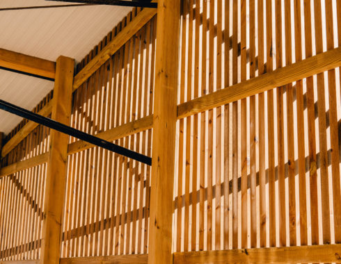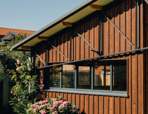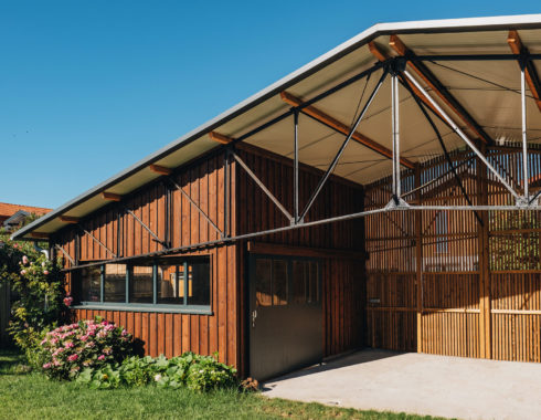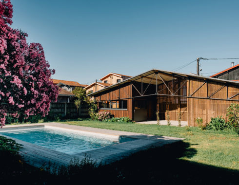 L’auvent a été refermé par un bardage à claire voie qui joue sur l’opacité et la transparence tout en filtrant les rayons du soleil et créant des ombres portées. La partie atelier est réalisée en ossature bois et recouverte de bardage bois à couvre-joints. Les menuiseries sont en aluminium sombre pour rappeler la structure existante. La toiture a été entièrement refaite et la structure renforcée. Le bassin existant a également été rénové pour créer une piscine.