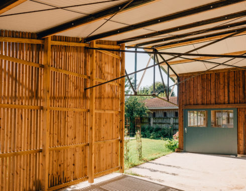 Au départ du projet il y a une structure métallique couverte et ouverte sur les quatre cotés. La structure à été sablée et la toiture désamiantée pour accueillir un atelier.