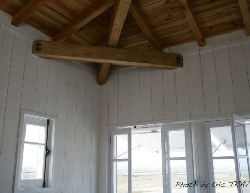 Le projet a redonné à la construction ses dispositions originelles : un volume simple surmonté d’un toit à deux étaux, situé au centre d’une vaste plate-forme qui permet une observation périphérique de l’environnement (fonction initiale de surveillance des parcs à huîtres).
