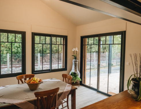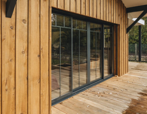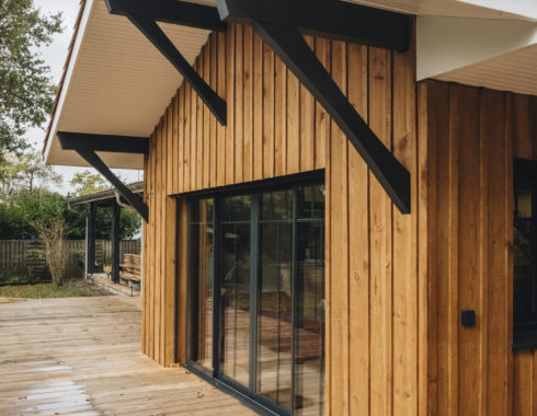La maison se situe sur la commune de La Teste de Buch. Les habitants souhaitaient agrandir leur espace de vie : cuisine et séjour. Une extension en ossature bois a été créée en façade Sud. Les nouveaux volumes sont habillés par un bardage bois vertical en pin clair réalisé en planches avec des couvre joints. De larges ouvertures ont été dessinées en aluminium de teinte sombre. Les volets roulants sont intégrés dans les murs à ossature bois.