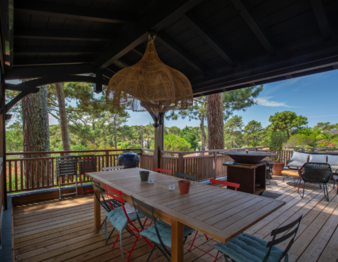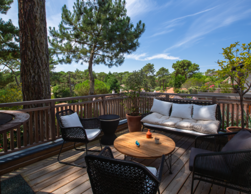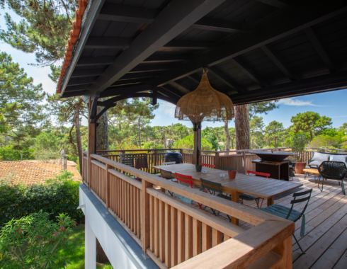 À l’étage, la petite terrasse est largement agrandie pour créer un véritable espace à vivre. La terrasse vient couvrir la nouvelle chambre et dessine également un espace abrité pour garer une voiture au rez-de-chaussée. Une couverture ainsi que des brise-vues en bois sont édifiés sur une partie de la terrasse. Ce dispositif fait naître différents espaces, entre ombre et soleil. Il donne également du caractère à la bâtisse, avec le dessin d’une ferme décorative cintrée.